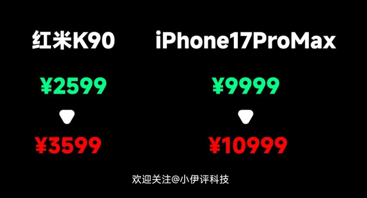 如下图所示,假定红米K90从2599加价到3599和iPhone17ProMax从9999元加价到10999元,公共以为谁的销量会受到较大影响?那势必是前者。