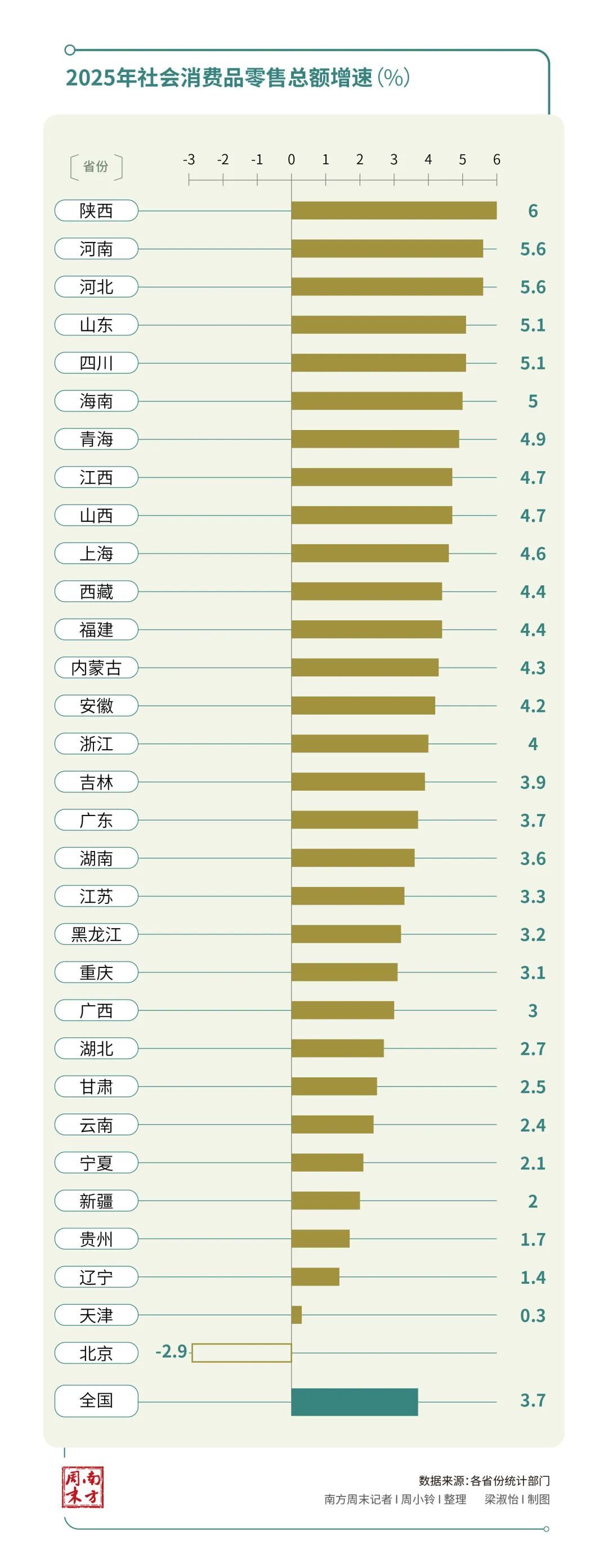 河南、河北以5.6%的增速比肩第三,压过湖北、安徽等中部强省。在增速排行上,上海和北京从中下流挤进了前五,山西开脱了末位。