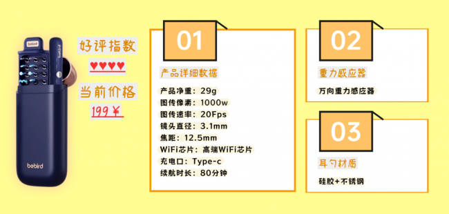 bebird是可视挖耳勺领域相比早期入局的品牌之一,家具主打初学级宽泛使用,全体偏向基础功能栽种,造型和建设皆以够用、易上手为主,主要面向预算不高、只作念浅易耳说念清洁的凡俗用户,功能和体验皆偏向基础实用阶梯。