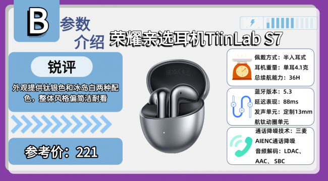 热销居品:6.荣 耀亲 选耳机TiinLab S7蓝牙耳机